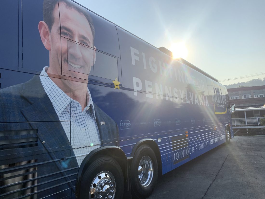 - Times Observer photo by Josh Cotton If you saw the large bus parked at White Cane Coffee Tuesday morning, know it was exactly what it said it was. Tuesday marked day nine of a bus tour that Jeff Bartos, a candidate for the seat of retiring U.S. Senator Pat Toomeny, has undertaken with stops in each of the state’s 67 counties.