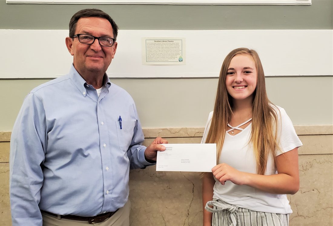 Times Observer photo by Brian Ferry Community Foundation of Warren County Executive Director John Lasher presents the first Thomas Huber Memorial Scholarship to Allison Schmader, who will student business management at the University of Pittsburgh at Bradford in the fall.