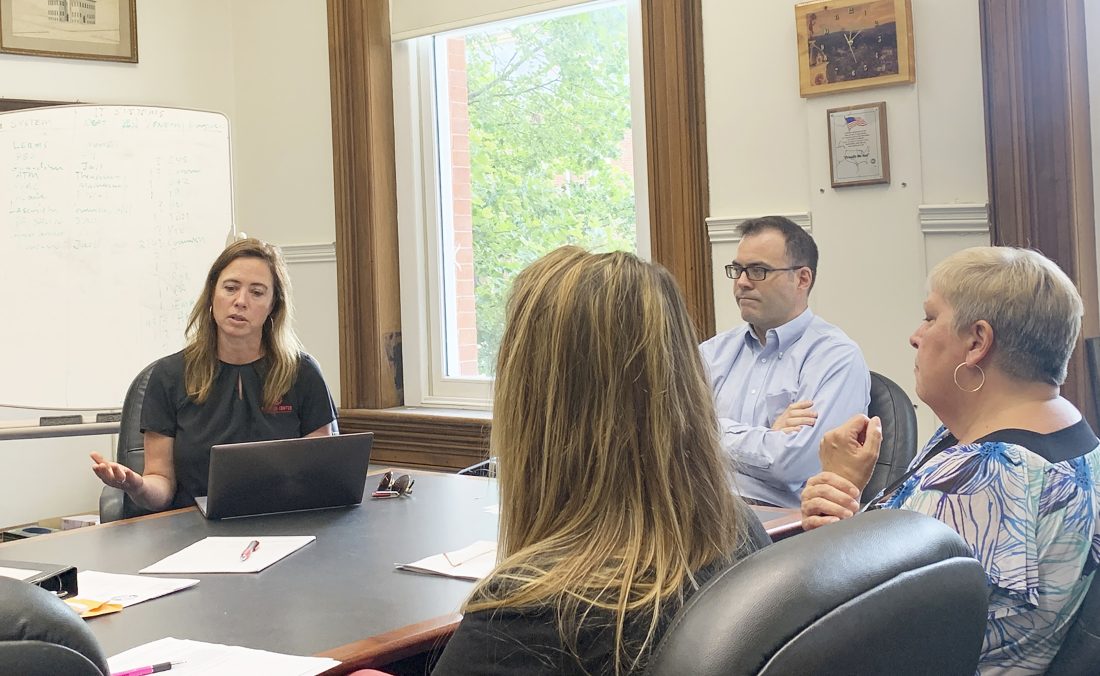 Times Observer photo by Josh Cotton The Warren County Commissioners on Monday heard from Ta Enos, left, founder & CEO of the PA Wilds Center, about a pilot program aimed at recruiting remote workers to the region.