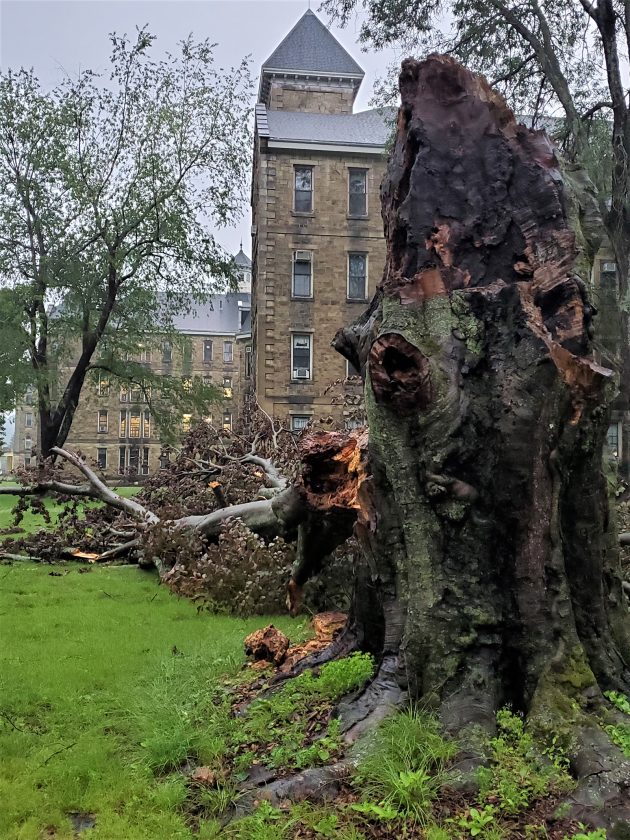 One particular tree, about 5 feet in diameter, was broken off close to the ground right in front of the Main Building. The tree fell parallel to the front of the building, missing the structure.