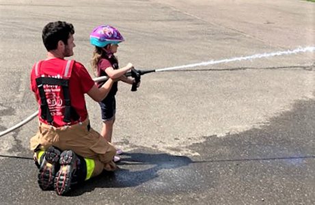 Photo submitted to Times Observer A Youngsville Volunteer firefighter helps Kennedy Leach put out the fires at Puff the Dragon in the parking lot at Youngsville Volunteer Fire Department during the Youngsville Borough Police Department Bicycle Rodeo on Saturday.