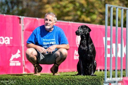 - Walt Stover of Tidioute and Millie wait for their turn at a North America Diving Dogs event.