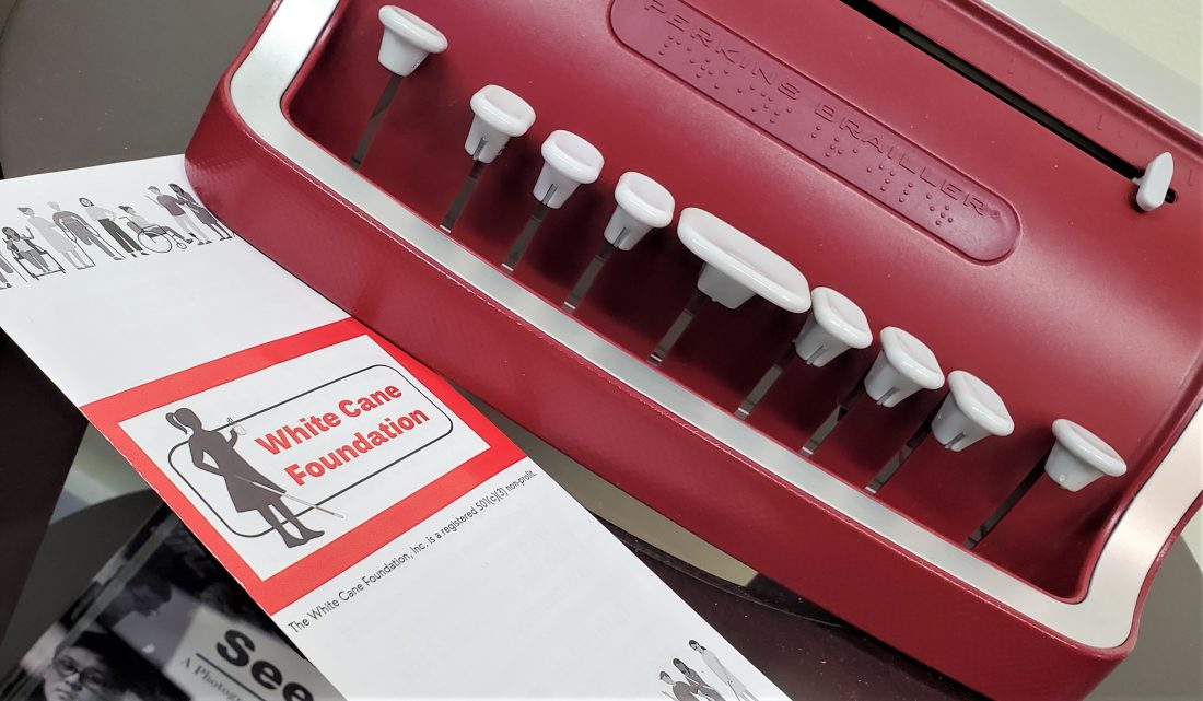 Times Observer photo by Brian Ferry Finding and funding a Brailler — a Braille typewriter — like this one on display at White Cane Coffee, is the kind of thing the White Cane Foundation can do to help a family or individual in need of vision services.