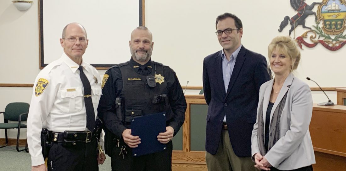 Times Observer photo by Josh Cotton Warren County Sheriff’s Deputy Mark Lehnen, second from left, was presented with a Citation of Excellence by the Warren County Commissioners for his role in de-escalating a barricaded standoff incident earlier this month. Also in the photo are, left, Sheriff Brian Zeybel and commissioners Jeff Eggleston and Tricia Durbin.