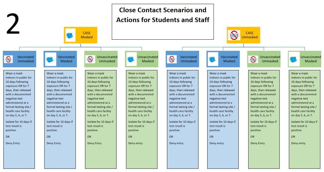 The district’s modified “close contact scenarios and actions for students and staff” document is the same across the board: