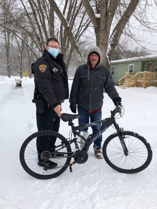 Photo provided to the Times Observer Here, Youngsville Borough Police Chief Todd Mineweaser presents Fred Sivi with a new bike donated by Walmart. Sivi’s bicycle was struck by a plow in the wake of this past weekend’s winter storm.
