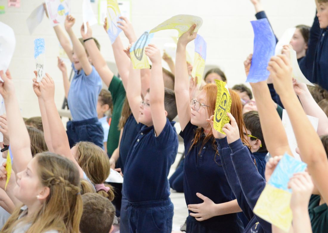 Times Observer photos by Brian Ferry St. Joseph Catholic School students hold up signs they made in support of Ukrainian students who are refugees from the Russian invasion and are staying 700 miles from their home with a Slovakian woman who is friends with Fr. Rick Tomasone on Friday during an assembly.