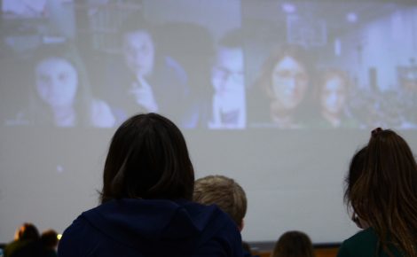 Times Observer photo by Brian Ferry St. Joseph Catholic School students watch a Zoom call on the screen in the school’s gymnasium Friday between the school and two Ukrainian students who are refugees staying 700 miles away from their home with a woman who is friends with Fr. Rick Tomasone. On the screen at left are siblings Sasha, 9, and Ivan, 11, with their host, Barbara.