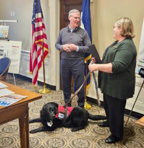 Photo submitted to Times Observer Tidioute Community Charter School ninth and tenth graders present a sign to Dr. Bill Hanson, who shares his expertise at the school every year around Fish Week.
