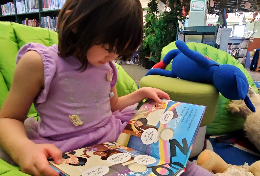Times Observer photo by Brian Ferry Nova Gustafson, 5, of Warren, drops everything to read “How to Catch a Unicorn” in the Warren Public Library Children’s Department on Tuesday, national Drop Everything and Read Day.
