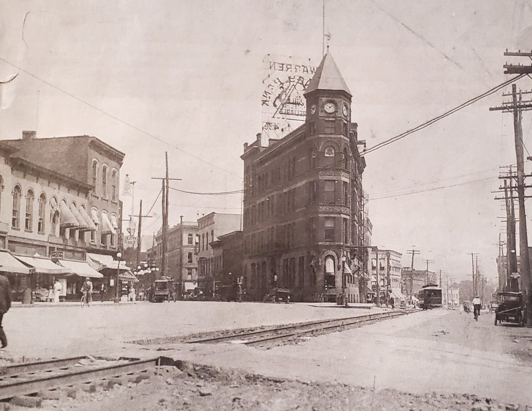 A triangular structure was first built there in 1876. But, the layout of the block was a triangle, so an occupant at the west end would have to adopt that shape. Before anyone took on the western part of the block, the eastern half was the site of one of Warren’s first brick business blocks.