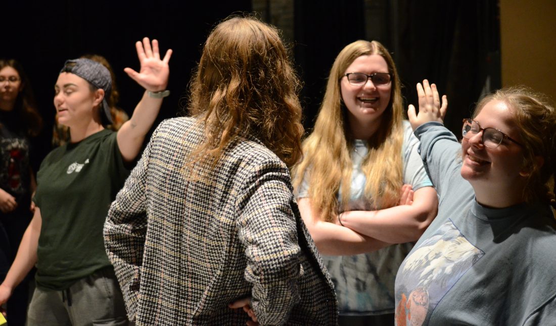 Times Observer photo by Brian Ferry Arrianna Daniels of the Pennsylvania Shakespeare Festival (left) reacts as Julius Caesar (Marissa VanGuilder), with support from Mark Antony (Winnie Wolf), tells the soothsayer (Jurney Mennetti) to ‘speak to the hand’ during a choreography workshop at Struthers Library Theatre.