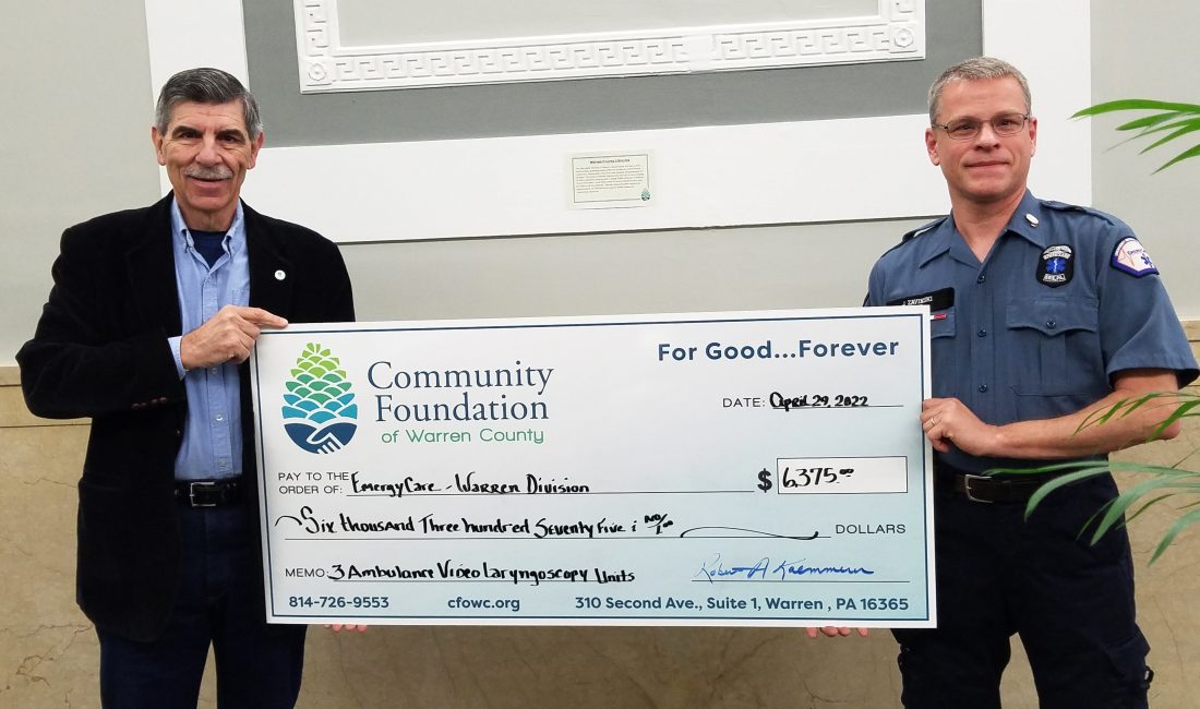 Photo submitted to Times Observer Community Foundation of Warren County Executive Director Robert Kaemmerer (left) presents a check for $6,375 to EmergyCare Warren Division EMT James Zavinski toward the purchase of video laryngoscopes for its emergency vehicles in the county.