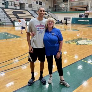 “I was behind the bench and heard the announcer say, ‘We have a referee down,'” recalled Marsh. “I hurried to the scorer’s table, saw John down, thought, did he fall, trip, collide with a player? But he was motionless. The referees motioned for me to come onto the court. Halfway there, they were yelling to call 911. My phone was on the bench, so I turned and yelled for Kayla to call. At John’s side, there was no pulse or respirations when a young man’s voice said, ‘I’m a fireman,’ and he started compressions. As we were waiting for the AED, there was a lot of commotion, but we were able to just keep assessing John … asking volunteer staff to make a wall around us, assessing John over and over; at which point, I began compressions. The fire department arrived as well as AllStar (Response), and we all continued to work as a team. John became responsive.