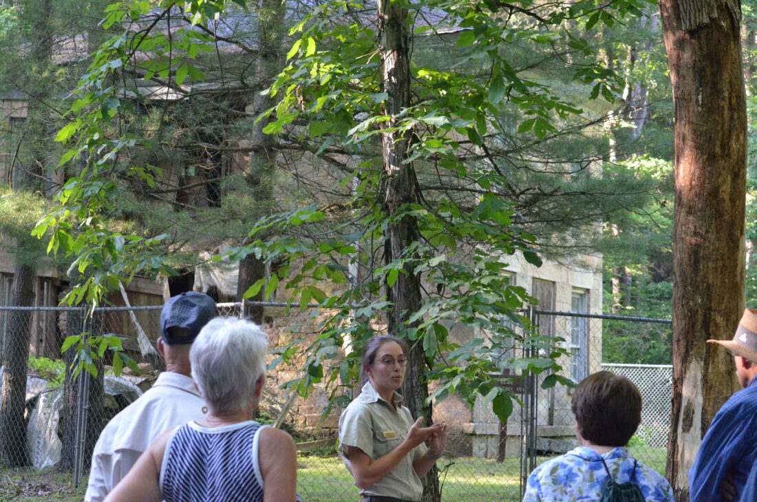 Times Observer photos by Josh Cotton ANF District Archaeologist Zaakiyah Cua speaks during a tour of the Irvine-Newbold mansion held last week. The structure in the background is one of several stone houses built as part of the estate specifically to house the workers needed to make the estate operate.