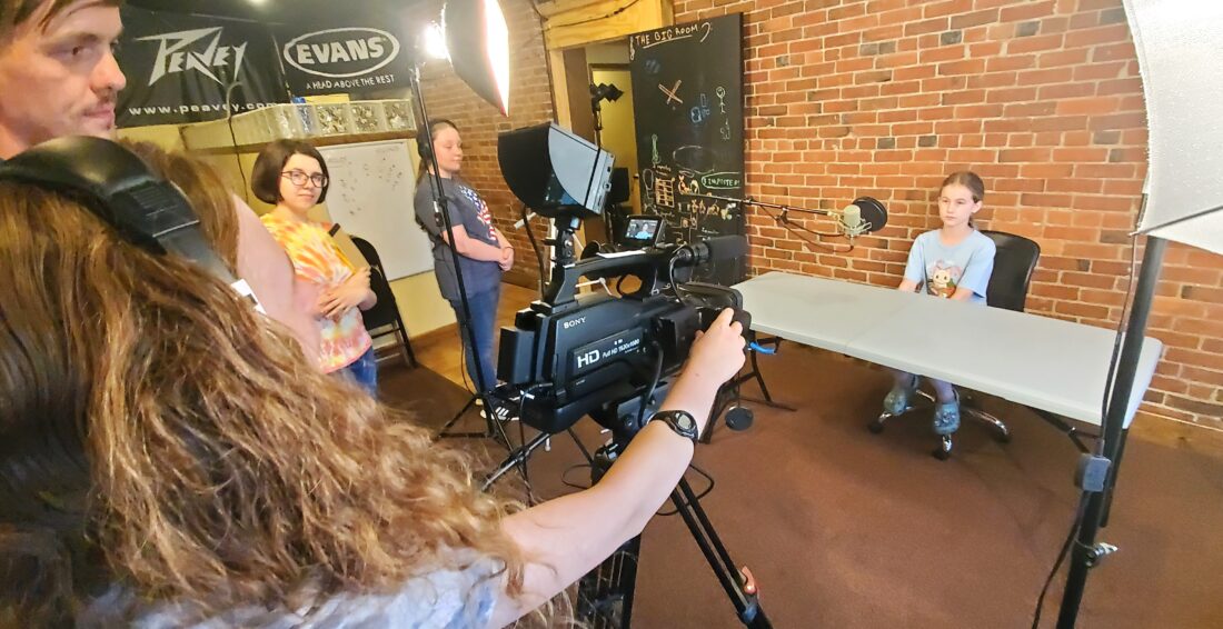 Times Observer photo by Brian Ferry Instructor Mark Robinault guides Warren County Youth Network students — including director Cameron Erwin and subject Alix Peterson — through the audio, video, lighting, and other details of an interview.