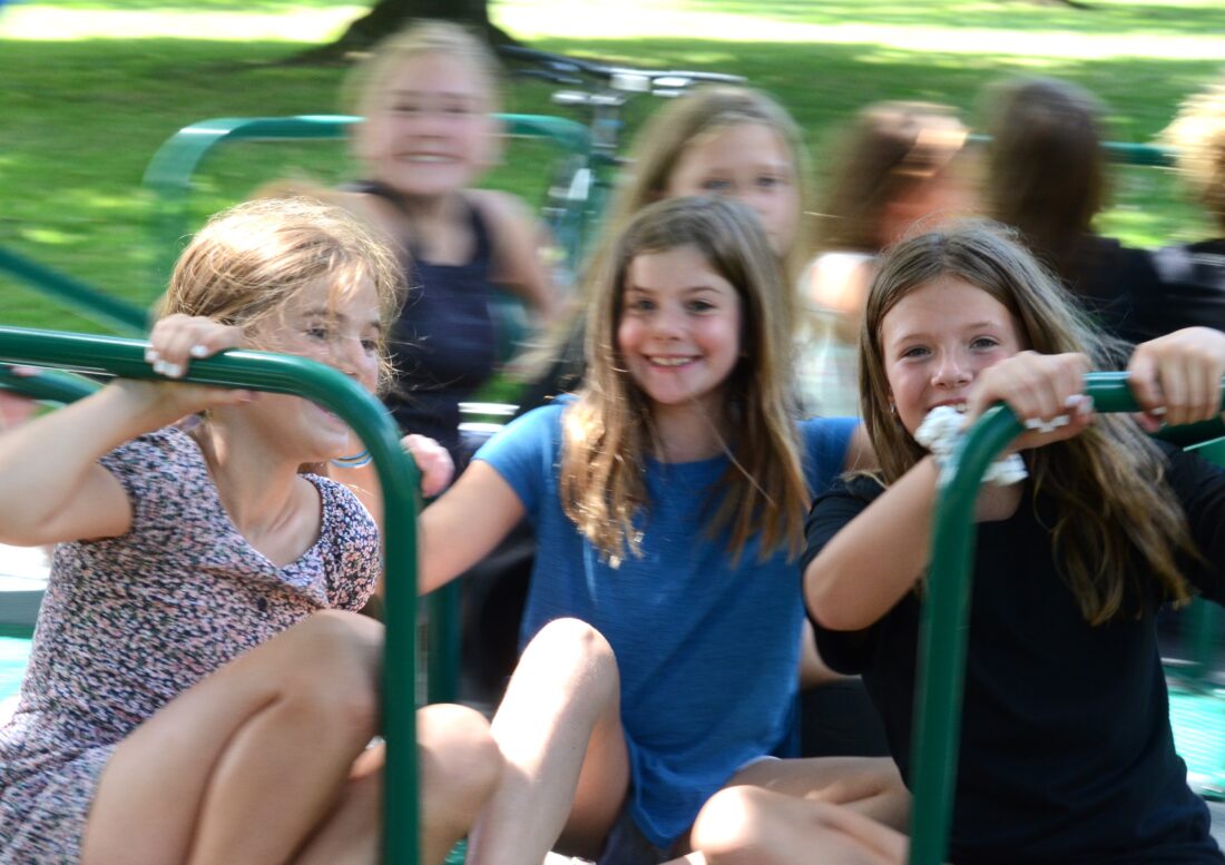 City of Warren Playground Program participants (from left) Caroline Curren, Audrey Wurst, and Luci Salvatore go for a spin on the merry-go-round at Beaty Playground on Tuesday.