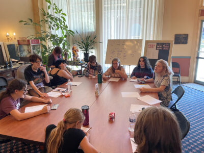 Photos by Michael Zabrodsky Playwrite students gather ideas and draw pictures that represent their characters. Clockwise from bottom are Eli Eastman, Bridgette Branch, Adriana Royo, Ollie Manross, Asher Button, Macy Winicki, Kayla Oaks, Mady Nobles, Gretchen Wiler, and Evelyn Mechling.