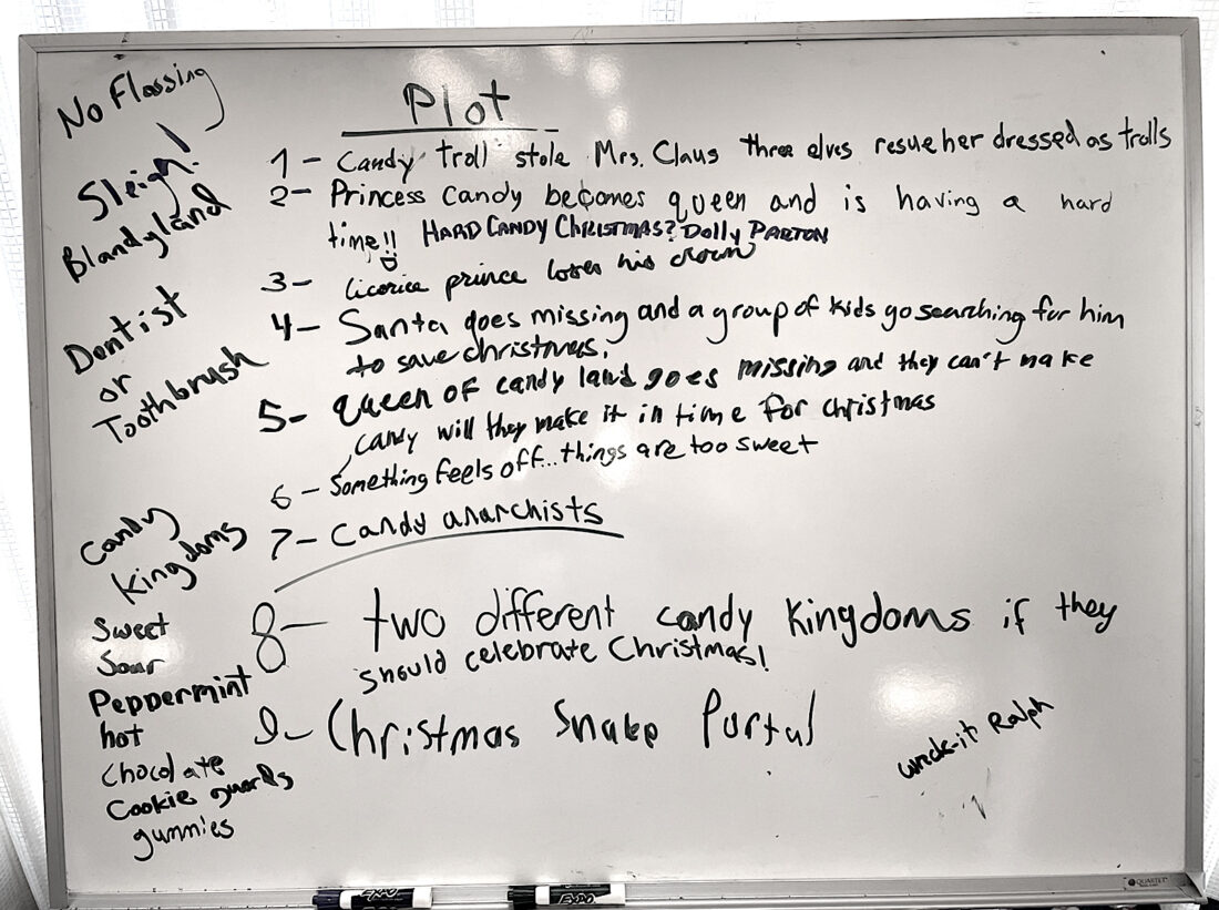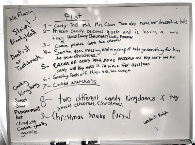 During a recent session, the students drew pictures that represented their characters. The catch — each student’s character had to be based on a piece of candy. Morelli stood before the white board and began to name elements and types of candy. On the board the words gumdrops, cotton candy, marshmallow, peppermint, and lollipos were already written. These may become candy kingdoms.