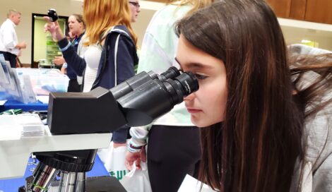 Times Observer photo by Brian Ferry Beaty-Warren Middle School eighth-grader Allie Papalia peers through a microscope at a blood sample at the Warren General Hospital display at eighth grade career day hosted by Warren-Forest Higher Education Council School-to-Work program.