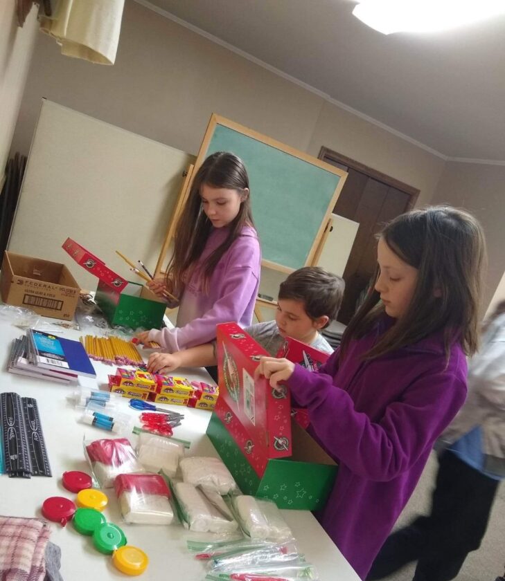 - Photo provided to the Times Observer From left, Hailey Campman, Landon Campman and Clara Schmidt pack Operation Christmas Child boxes.