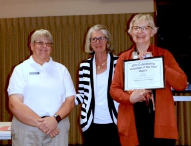 - Ruth Wahl (right) receives the Conewango Creek Watershed Association and Chautauqua-Conewango Consortium Outstanding Volunteer of the Year award from (left) Elizabeth Dropp of CCWA and Jane Conroe of CCC at the organizations’ annual gala.