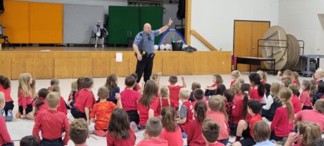 Photo provided to the Times Observer Chief County Detective Tom Kibbey, with K9 Dina, speaking to students last week at St. Joseph Catholic School.