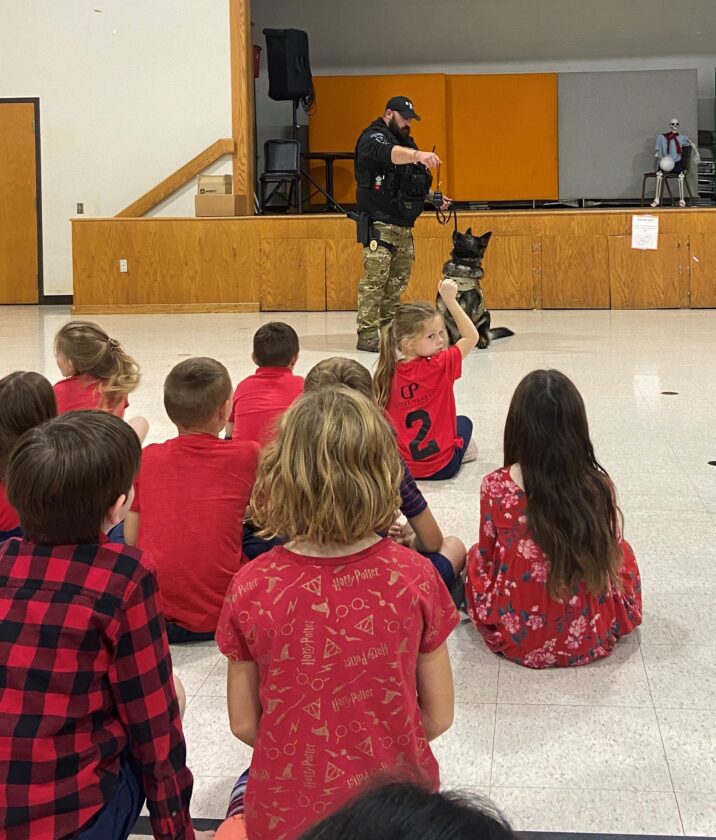 - Photo provided to the Times Observer Chief County Detective Tom Kibbey, with K9 Dina, speaking to students last week at St. Joseph Catholic School.