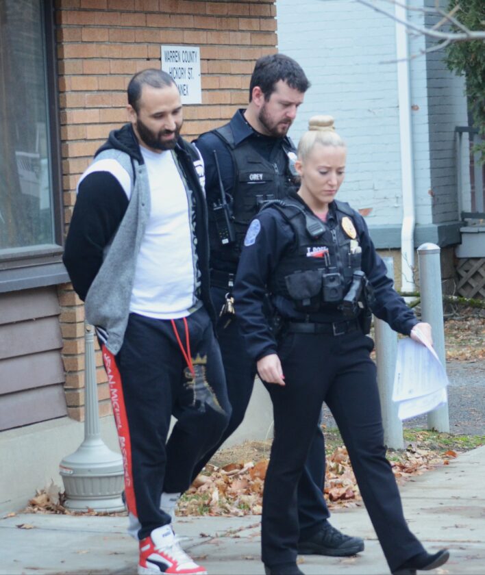 Times Observer photo by Brian Ferry Cleverson K. Knappenberger is escorted by City of Warren Police out of District Judge Raymond Zydonik’s office Monday after he was arraigned on charged of indecent assault and corruption of minors.