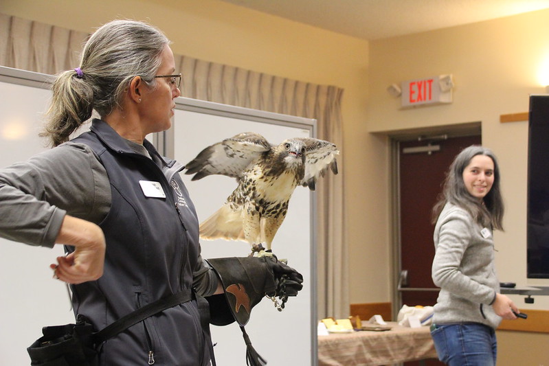 Submitted Photo The public can visit with and learn about Audubon Community Nature Center’s animal ambassadors at Christmas with the Critters on Tuesday, Dec. 27. Audubon Nature Educator Emma Roth, at right, describes Soren, as Sarah Hatfield, education coordinator, is about to give the Red-tailed Hawk a treat.