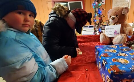 Times Observer photo by Brian Ferry Kylie Guiher waits her turn to enter for a chance to win the bear while Kenzie Guiher fills out her ticket Friday at the Sugar Grove Laundromat during a Sugar Grove Christmas.