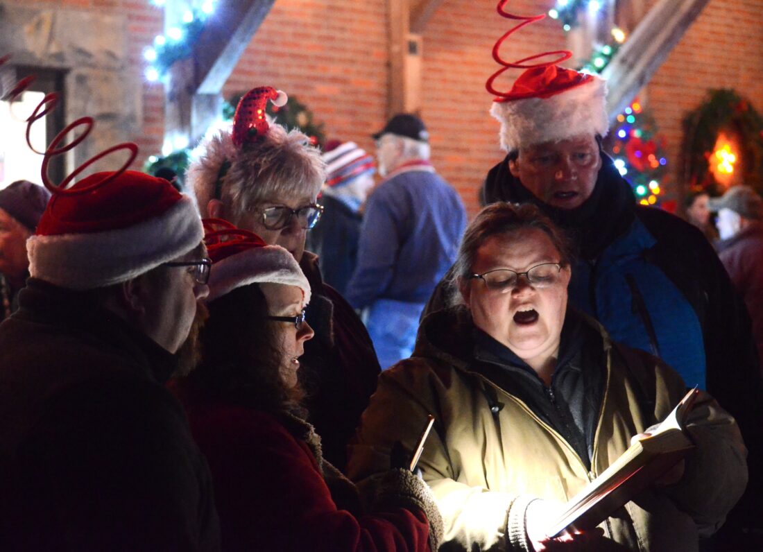 Times Observer photo by Brian Ferry Carolers from Sugar Grove Mission Covenant Church (from left) Robert Knisley, Jen Knisley, Mary Sweeney, Amy Smith, and Todd Sweeney sing Friday night outside of Wilcox Brothers Hardware during a Sugar Grove Christmas.