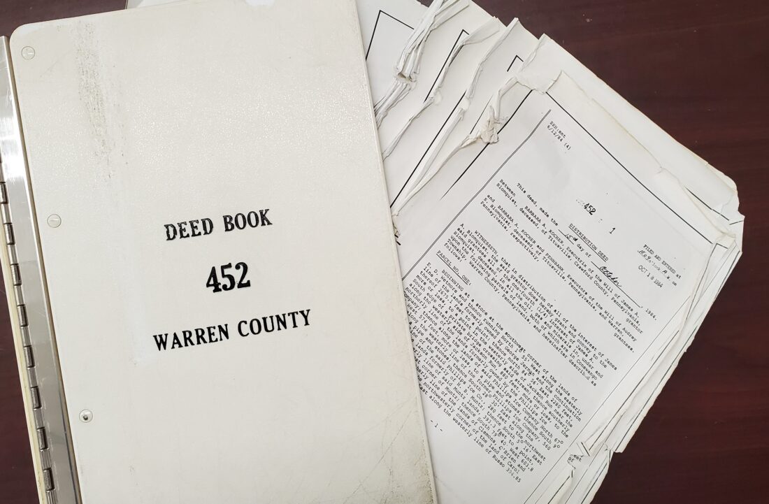Times Observer photo by Brian Ferry The pages torn out of a deed book at the Warren County Register and Recorder’s Office have been returned - somewhat worse for wear. The person accused of the damage has entered a plea to tampering with a public record.
