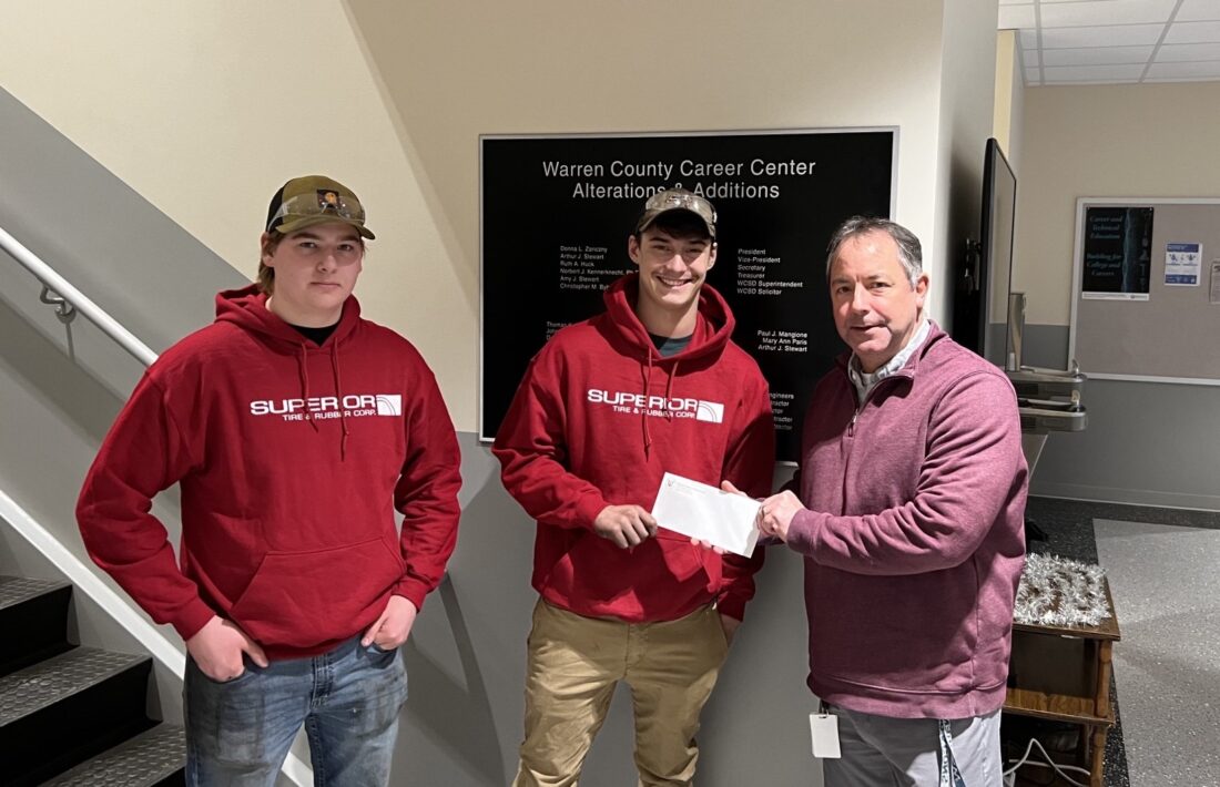 Photo provided to the Times Observer Superior Tire & Rubber Corp. recently supported the technical education programs offered at the Warren County Career Center. Presenting Principal James Evers with Superior’s latest donation are WCCC alumnus Josh Parker and current student Daniel Drum. Both Parker and Drum are current Superior Tire manufacturing employees. Funds from the donation will go toward student needs for SkillsUSA, DECA, and FBLA competitions.