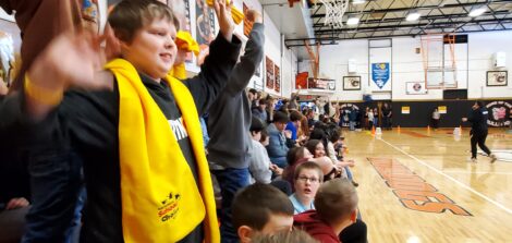 Times Observer photo by Brian Ferry Tidioute Community Charter School sixth-grader Zach Hulse, wearing his School Choice scarf, cheers during the school’s School Choice Week celebration Friday.