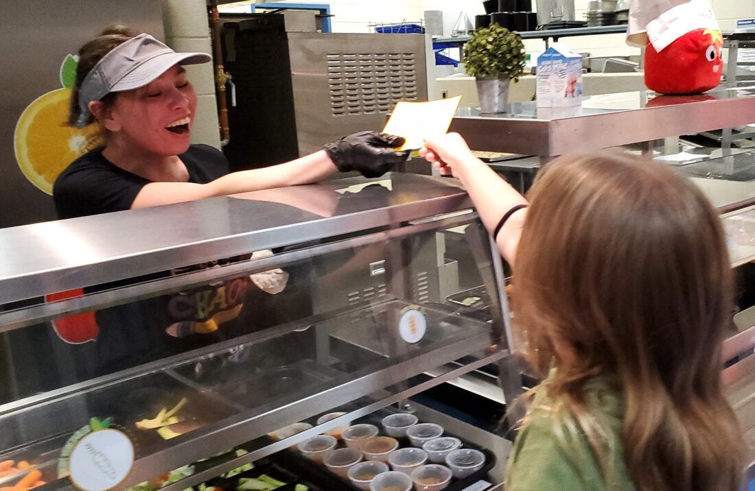 Cafeteria Helper Katie Vermilyea had to reach over a counter to receive her letter, but she insisted on coming out into the cafeteria for a hug after reading it.