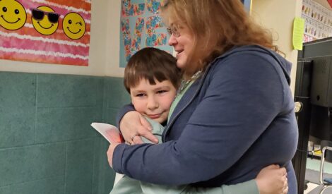 Times Observer photo by Brian Ferry Warren Area Elementary Center third grader Emory Buchanan receives a big hug from Teacher Lanna Gardner after he presented her with a thank you letter on the 100th day of school.