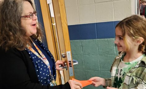 Times Observer photos by Brian Ferry Warren Area Elementary Center third grader Adelyn Hamilton presents a thank you letter to Cafeteria Helper Katie Vermilyea on the 100th day of school.