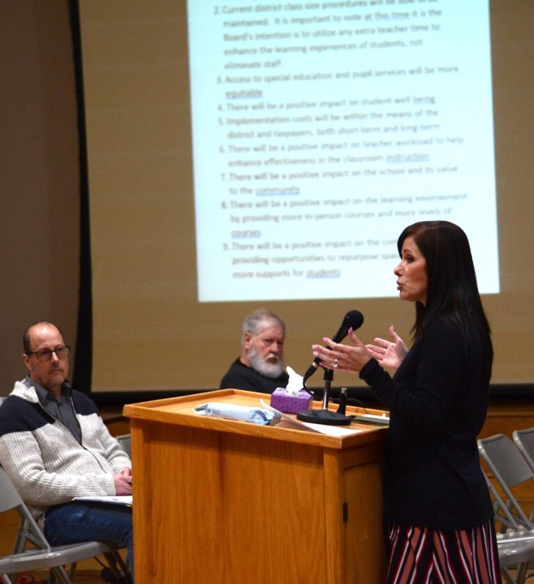 Times Observer photo by Brian Ferry Jacqui Catrabone of Strategy Solutions speaks during the opening of a Warren County School District community engagement and outreach meeting regarding reconfiguration Friday evening at the district’s central office.