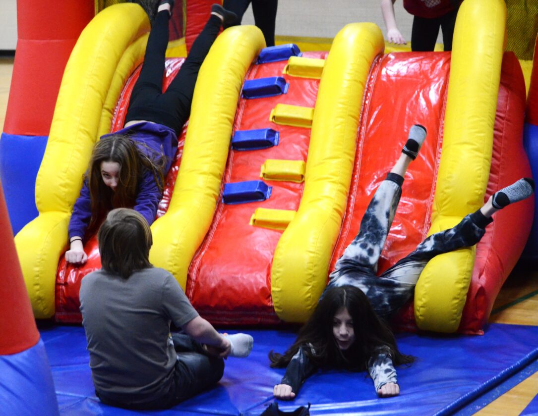 Times Observer photo by Brian Ferry Warren Area Elementary Center fourth-graders MiKaylee Massa (left) and Adryana Yande slide head-first down the slides out of a bounce house at the Warren County YMCA gym Tuesday morning. The class earned a trip to the YMCA by showing positive behaviors in physical education class during the second marking period.