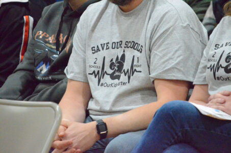 - Many of the 100 that attended Wednesday’s session in “Save Our Schools” shirts.