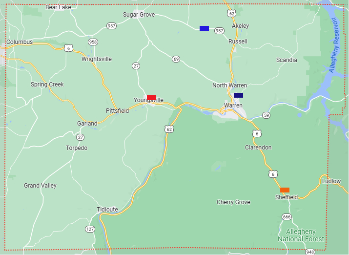 The Warren County School District is considering reconfiguring its high schools. Among the proposals on the table are closing Sheffield Area High School (orange) and moving those students to Warren Area High School (dark blue) and closing Youngsville High School (red) and moving those students to Eisenhower High School (bright blue).