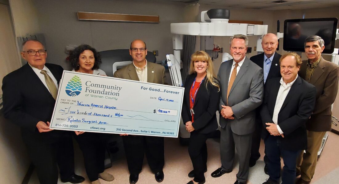 Times Observer photo by Brian Ferry Representatives of the Community Foundation of Warren County present a check for $400,000 to Warren General Hospital representatives in support of the Da Vinci robotic surgery system. Pictured, from left, are Community Foundation board members Bernard J. Hessley, Vicki Stec, and Michael DelPrince, WGH Director of Surgical Services Michele Welker and CEO Rick Allen, Community Foundation board members Tim Huber and Steven Rothenberg, and Executive Director Rob Kaemmerer.