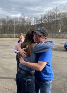 - Mike Card hugs EmergyCare paramedic Sadie Hoffman when the two met this week at the Youngsville Fire Hall. Hoffman, along with Michael Van Tassel and Elizabeth Kay, provided pre-hospital care for Card when he had a heart attack at Winterfest. Photos by Josh Cotton