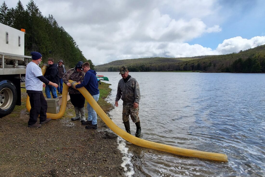 Times Observer photo by Brian Ferry A group of volunteers assist Corry Fish Hatchery Fish Culturist Toby Goble (left) in releasing about 1,700 rainbow and brown trout Monday into the lake at Chapman State Park