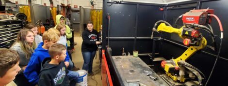 Times Observer photos by Brian Ferry Warren County Career Center welding students Nicholas Wolfer and BrookeLynn Woods talk with Eisenhower Elementary School fifth graders about a welding robot during career day.