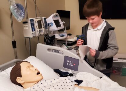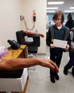 - St. Joseph Catholic School fifth graders Connor Schwabenbauer searches the Warren County Career Center Health and Medical Assisting rooms.