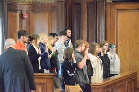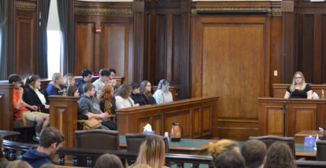 Skerda explained she hoped to challenge the students to think on democracy in light of the rights they are most likely to exercise — the right to vote and the responsibility to sit on a jury.