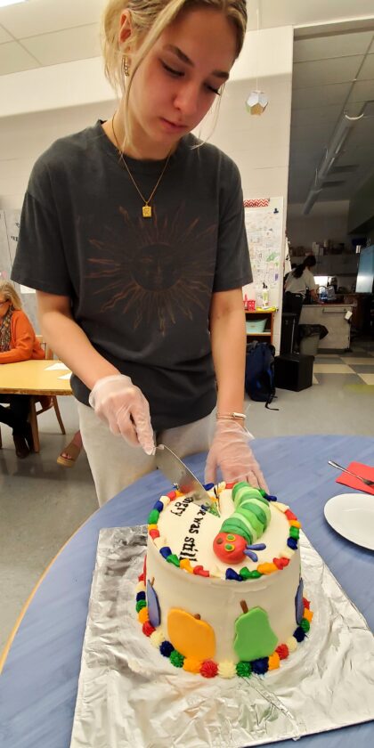 Warren Area High School student Kirsten Johnson cuts a slice of her team’s Very Hungry Caterpillar cake during the Cake Boss competition in Lewann Alexander’s Family Consumer Science class.