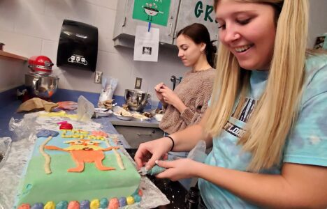 Warren Area High School students Gracie Gatto and Sydney Cochran put the finishing touches on their Lorax cake during the Cake Boss competition in Lewann Alexander’s Family Consumer Science class.